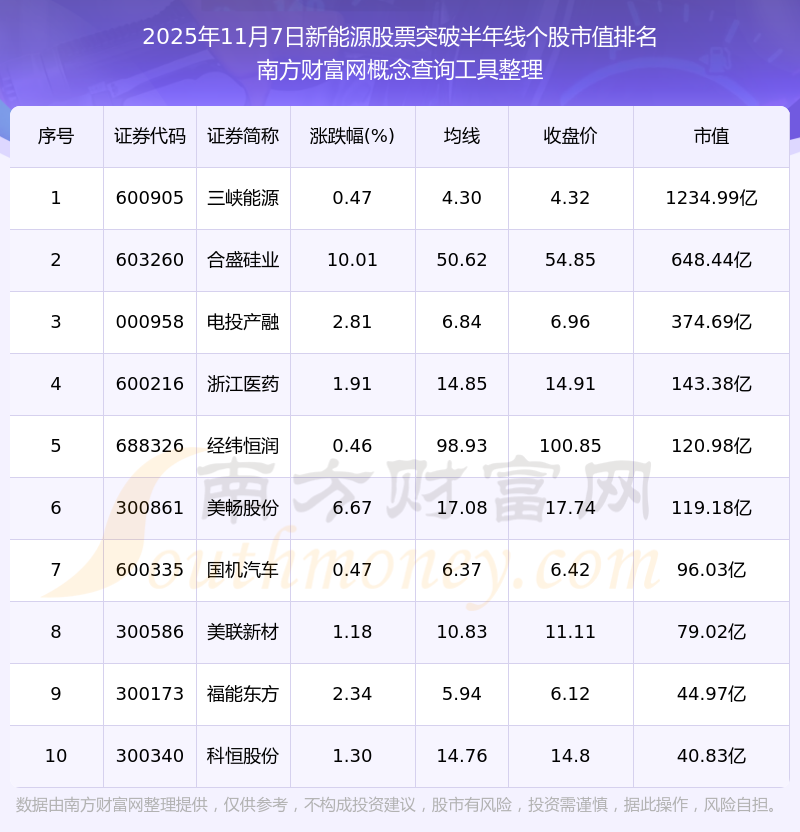 2025年11月7日新能源股票突破半年線個(gè)股市值排名