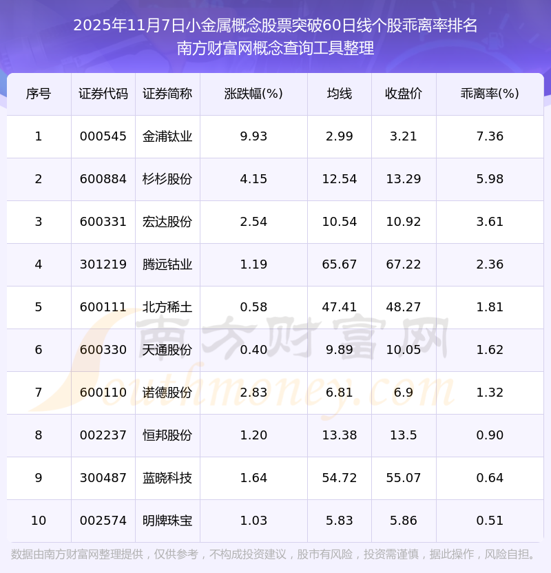 2025年11月7日小金屬概念股票突破60日線個(gè)股乖離率排名