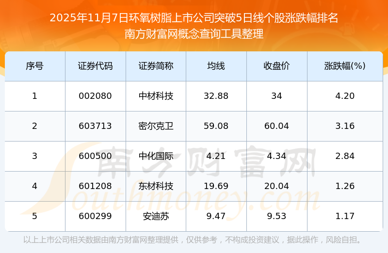 2025年11月7日環(huán)氧樹脂上市公司突破5日線個(gè)股漲跌幅排名