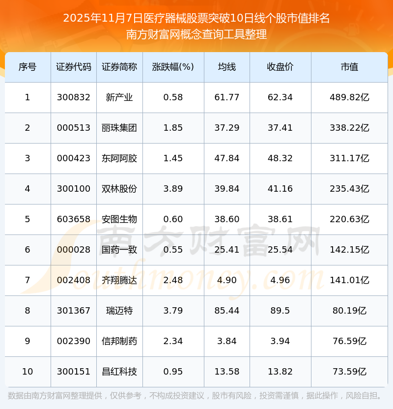 2025年11月7日醫(yī)療器械股票突破10日線個(gè)股市值排名