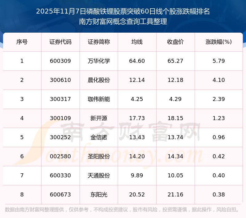 根據(jù)南方財富網(wǎng)概念查詢工具數(shù)據(jù)統(tǒng)計,截止2025年11月7日收盤,磷酸鐵鋰股票共有8只個股收盤價向上突破了60日線。其中漲幅較大的個股有萬華化學(xué)、晨化股份、珈偉新能等,漲幅分別為5.79%、4.10%、2.39%。