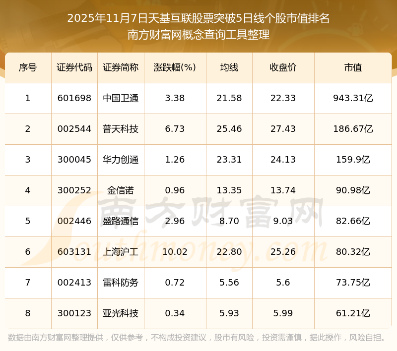 2025年11月7日天基互聯(lián)股票突破5日線個股市值排名