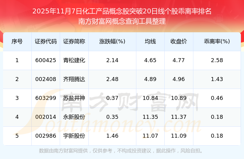 根據(jù)南方財(cái)富網(wǎng)概念查詢工具數(shù)據(jù)統(tǒng)計(jì),截止2025年11月7日收盤(pán),化工產(chǎn)品概念股共有5只個(gè)股收盤(pán)價(jià)向上突破了20日線。其中乖離率較大的個(gè)股有青松建化、齊翔騰達(dá)、蘇鹽井神等,乖離率分別為2.58%、1.43%、0.46%。