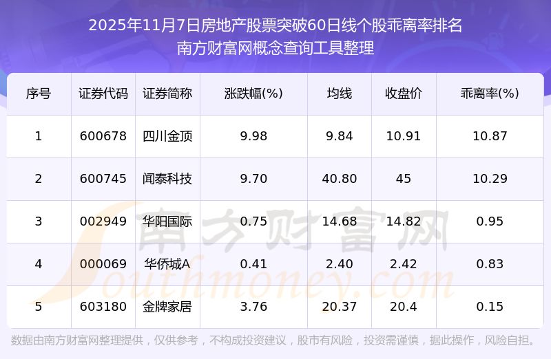 2025年11月7日房地產(chǎn)股票突破60日線個股乖離率排名