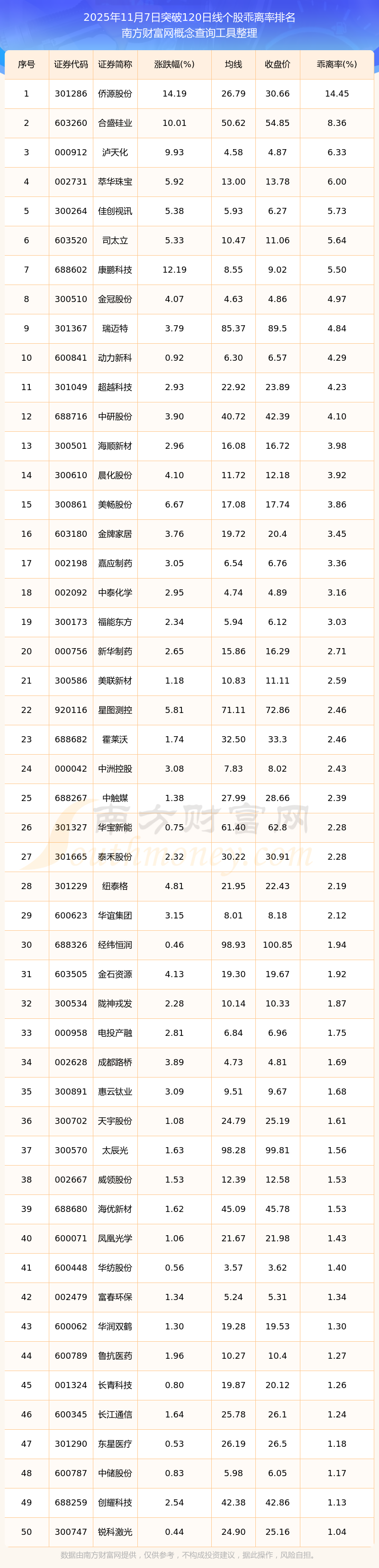2025年11月7日突破半年線個(gè)股乖離率排名