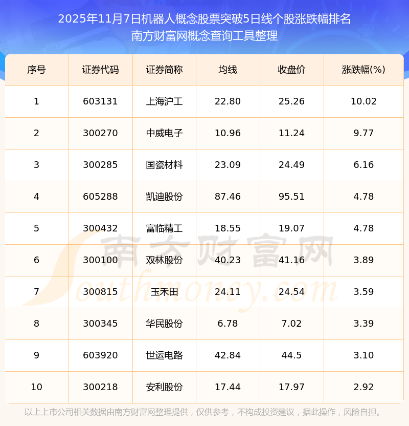 根據(jù)南方財富網(wǎng)概念查詢工具數(shù)據(jù)統(tǒng)計,截止2025年11月7日收盤,機器人概念股票共有42只個股收盤價向上突破了5日線。其中漲幅較大的個股有上海滬工、中威電子、國瓷材料等,漲幅分別為10.02%、9.77%、6.16%。
