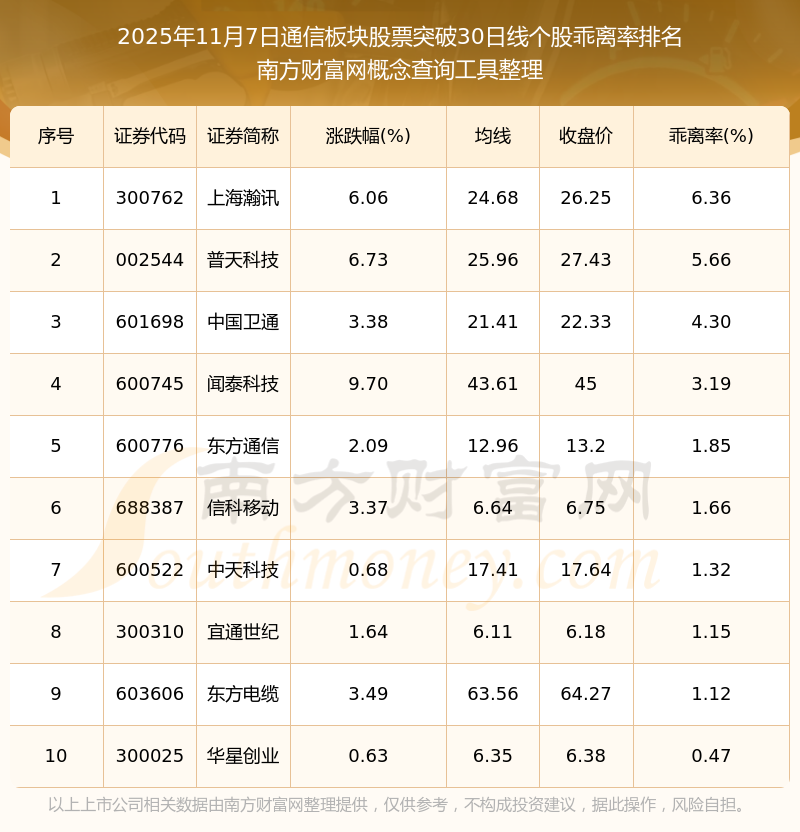 2025年11月7日通信板塊股票突破30日線個股乖離率排名