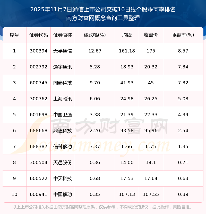2025年11月7日通信上市公司突破10日線個(gè)股乖離率排名