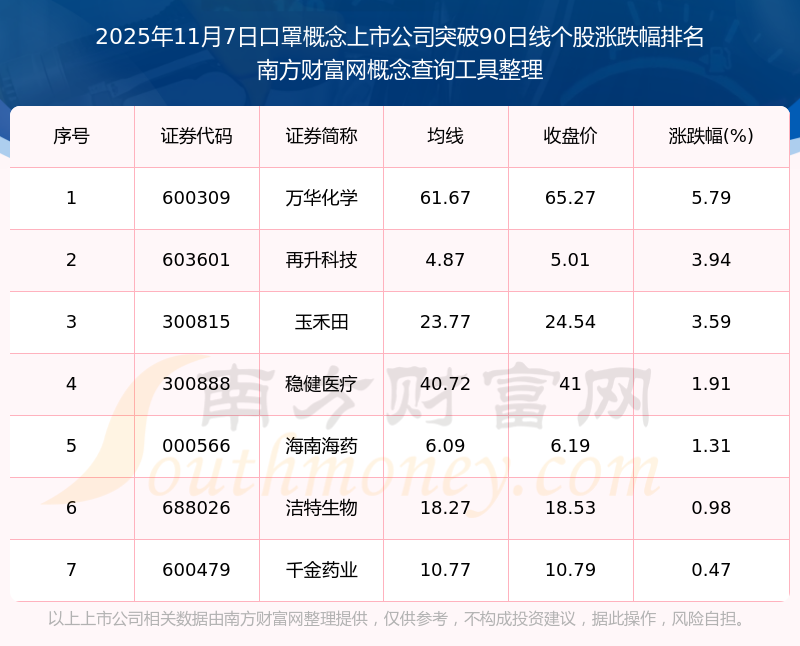根據(jù)南方財富網概念查詢工具數(shù)據(jù)統(tǒng)計,截止2025年11月7日收盤,口罩概念上市公司共有7只個股收盤價向上突破了90日線。其中漲幅較大的個股有萬華化學、再升科技、玉禾田等,漲幅分別為5.79%、3.94%、3.59%。