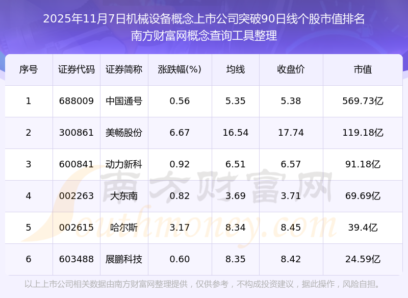 根據(jù)南方財富網(wǎng)概念查詢工具數(shù)據(jù)統(tǒng)計,截止2025年11月7日收盤,機(jī)械設(shè)備概念上市公司共有6只個股收盤價向上突破了90日線。其中市值較大的個股有中國通號、美暢股份、動力新科等,市值分別為569.73億、119.18億、91.18億。
