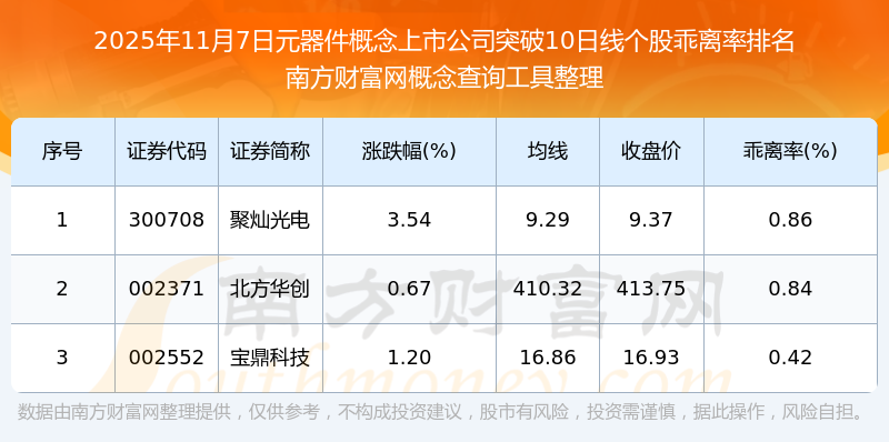 2025年11月7日元器件概念上市公司突破10日線個股乖離率排名