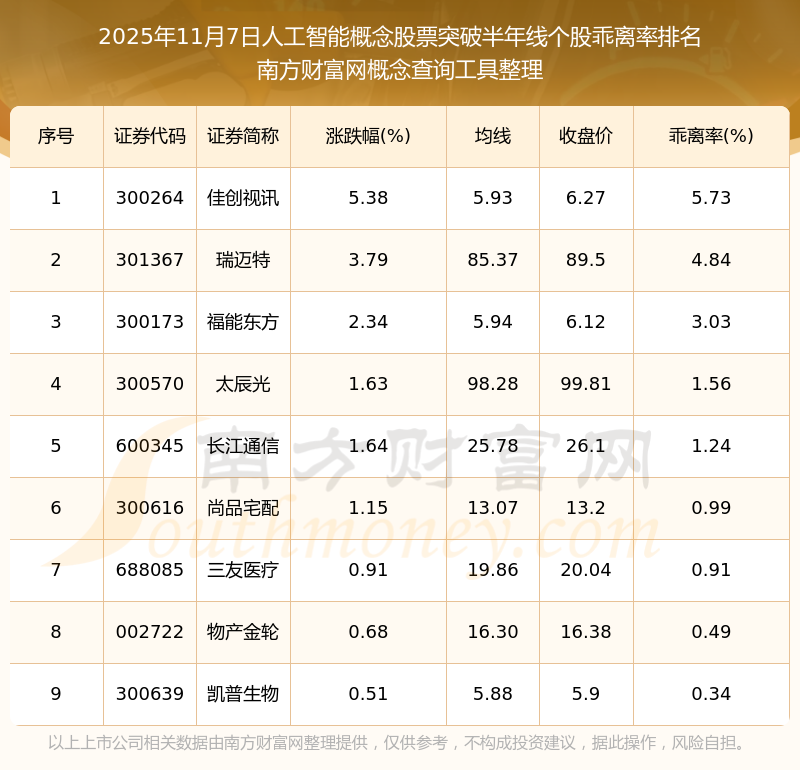 根據(jù)南方財(cái)富網(wǎng)概念查詢工具數(shù)據(jù)統(tǒng)計(jì),截止2025年11月7日收盤,人工智能概念股票共有9只個(gè)股收盤價(jià)向上突破了半年線。其中乖離率較大的個(gè)股有佳創(chuàng)視訊、瑞邁特、福能東方等,乖離率分別為5.73%、4.84%、3.03%。