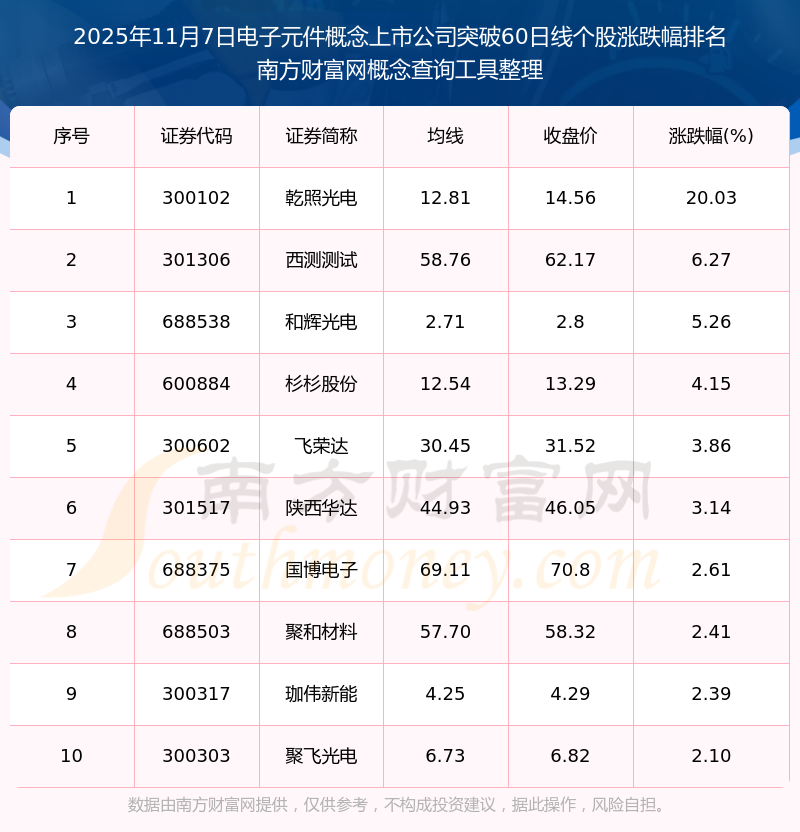 2025年11月7日電子元件概念上市公司突破60日線個(gè)股漲跌幅排名