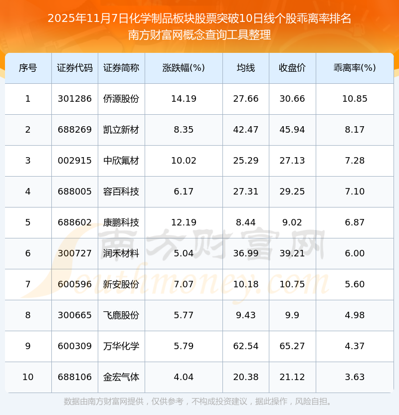 2025年11月7日化學(xué)制品板塊股票突破10日線個(gè)股乖離率排名