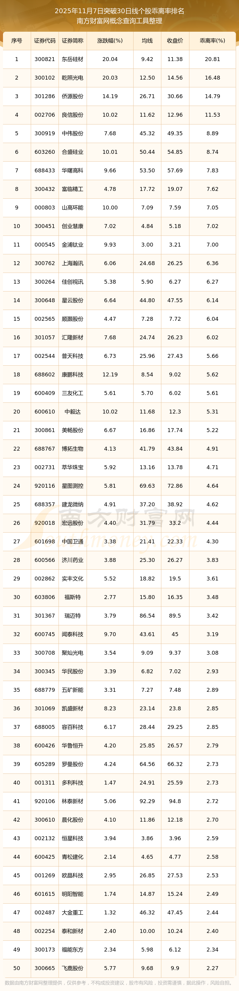 2025年11月7日突破30日線個股乖離率排名