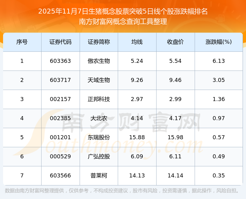 2025年11月7日生豬概念股票突破5日線個股漲跌幅排名