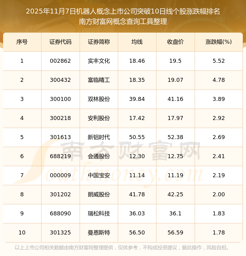 根據南方財富網概念查詢工具數據統計,截止2025年11月7日收盤,機器人概念上市公司共有32只個股收盤價向上突破了10日線。其中漲幅較大的個股有實豐文化、富臨精工、雙林股份等,漲幅分別為5.52%、4.78%、3.89%。