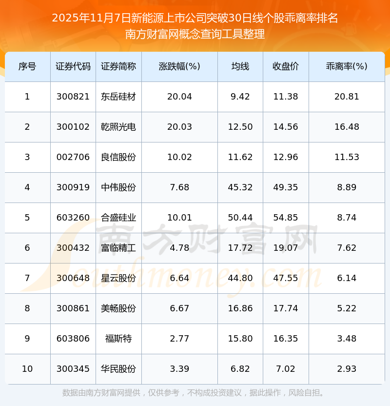 2025年11月7日新能源上市公司突破30日線個(gè)股乖離率排名