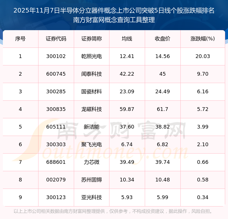 根據(jù)南方財富網(wǎng)概念查詢工具數(shù)據(jù)統(tǒng)計,截止2025年11月7日收盤,半導體分立器件概念上市公司共有9只個股收盤價向上突破了5日線。其中漲幅較大的個股有乾照光電、聞泰科技、國瓷材料等,漲幅分別為20.03%、9.70%、6.16%。