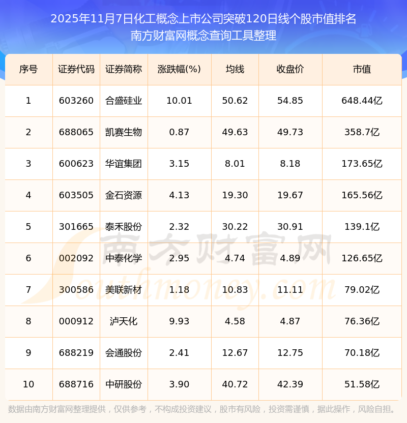 2025年11月7日化工概念上市公司突破120日線個(gè)股市值排名