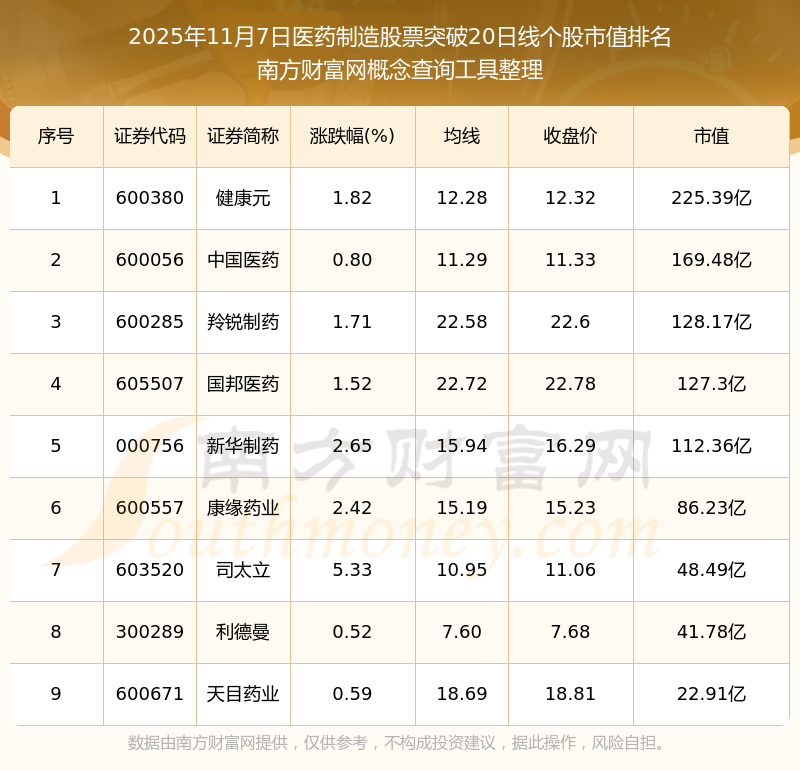 根據(jù)南方財富網(wǎng)概念查詢工具數(shù)據(jù)統(tǒng)計,截止2025年11月7日收盤,醫(yī)藥制造股票共有9只個股收盤價向上突破了20日線。其中市值較大的個股有健康元、中國醫(yī)藥、羚銳制藥等,市值分別為225.39億、169.63億、128.17億。