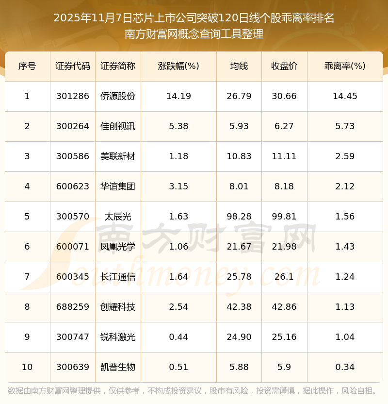 2025年11月7日芯片上市公司突破120日線個(gè)股乖離率排名