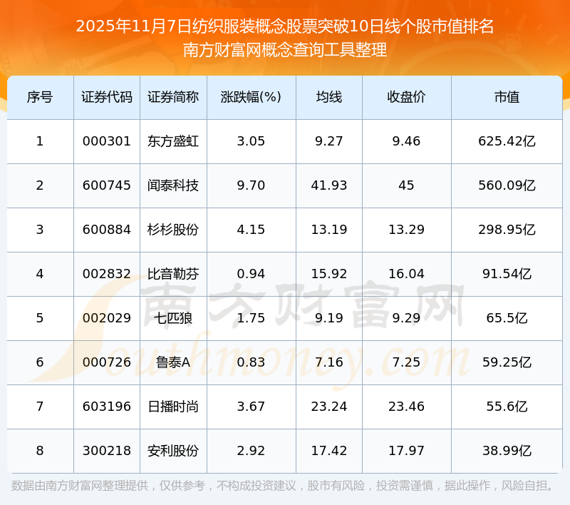 2025年11月7日紡織服裝概念股票突破10日線個股市值排名