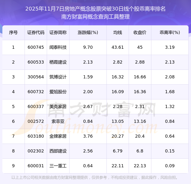 2025年11月7日房地產(chǎn)概念股票突破30日線個股乖離率排名
