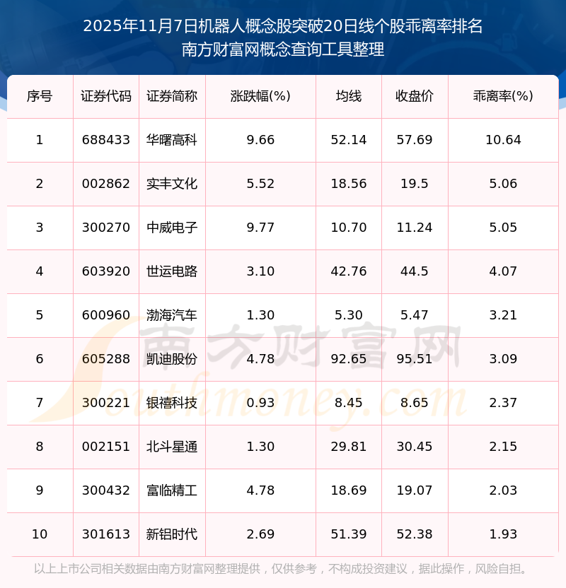2025年11月7日機(jī)器人概念股突破20日線個(gè)股乖離率排名