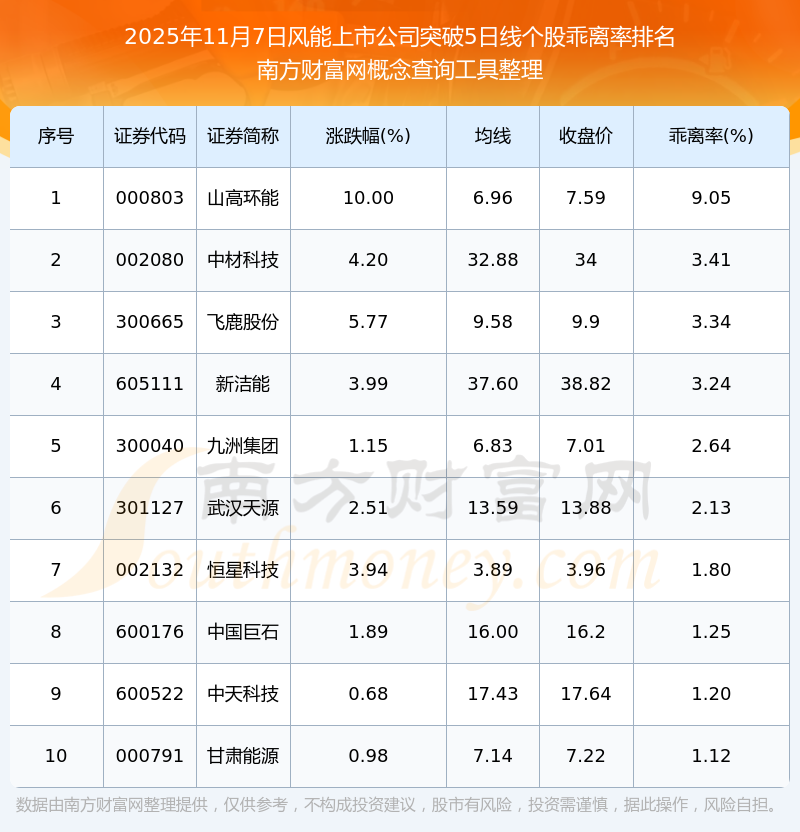 2025年11月7日風(fēng)能上市公司突破5日線個股乖離率排名