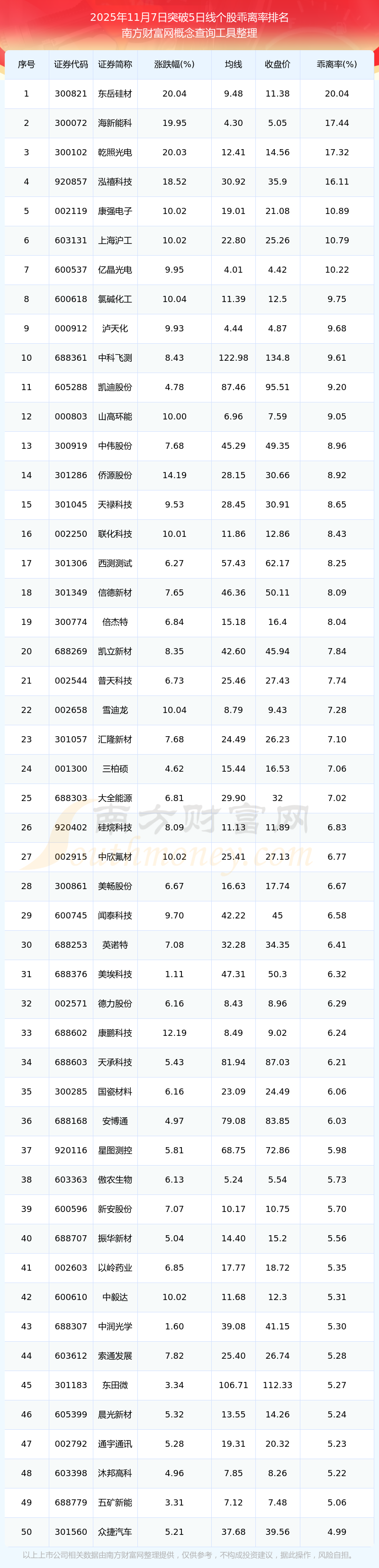根據(jù)南方財富網(wǎng)概念查詢工具數(shù)據(jù)統(tǒng)計,截止2025年11月7日收盤,共有431只個股收盤價向上突破了5日線,其中乖離率較大的個股有東岳硅材、海新能科、乾照光電、泓禧科技、康強電子等,乖離率分別為20.04%、17.44%、17.32%、16.11%、10.89%。