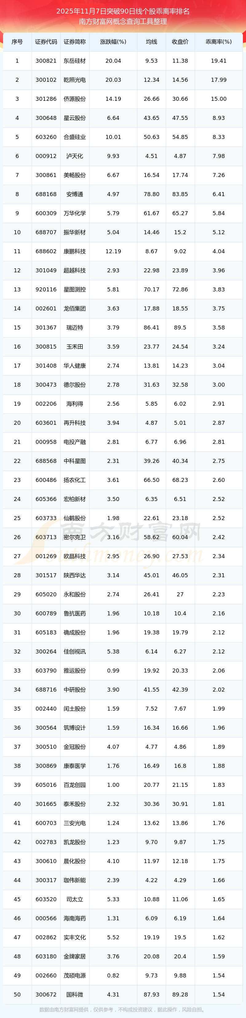 根據(jù)南方財富網(wǎng)概念查詢工具數(shù)據(jù)統(tǒng)計,截止2025年11月7日收盤,共有130只個股收盤價向上突破了90日線,其中乖離率較大的個股有東岳硅材、乾照光電、僑源股份、星云股份、合盛硅業(yè)等,乖離率分別為19.41%、17.99%、15.00%、8.93%、8.33%。