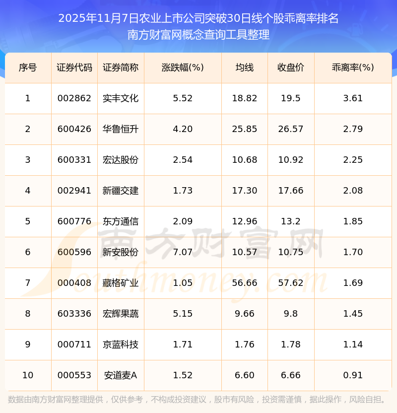 2025年11月7日農(nóng)業(yè)上市公司突破30日線個股乖離率排名