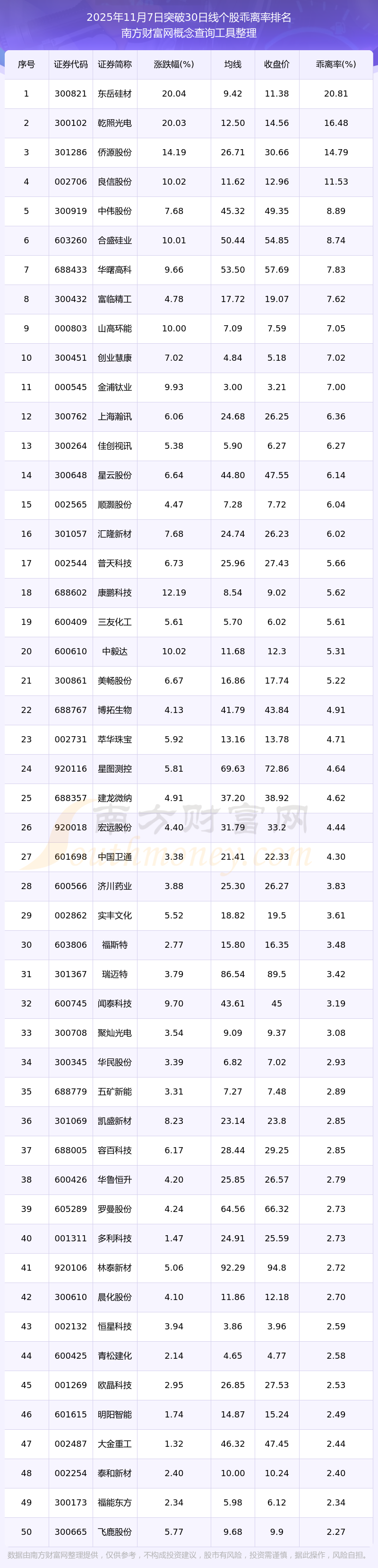 2025年11月7日突破30日線個(gè)股乖離率排名