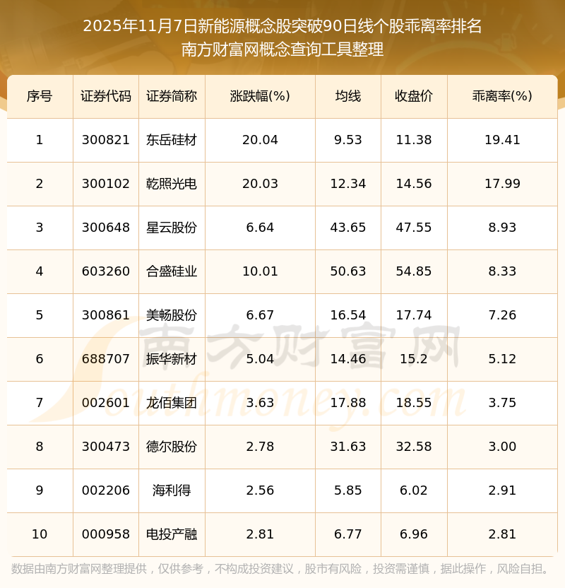 根據(jù)南方財富網概念查詢工具數(shù)據(jù)統(tǒng)計,截止2025年11月7日收盤,新能源概念股共有25只個股收盤價向上突破了90日線。其中乖離率較大的個股有東岳硅材、乾照光電、星云股份等,乖離率分別為19.41%、17.99%、8.93%。