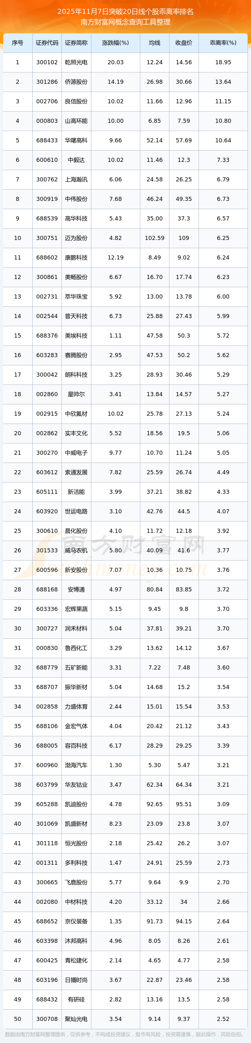 根據(jù)南方財富網(wǎng)概念查詢工具數(shù)據(jù)統(tǒng)計,截止2025年11月7日收盤,共有181只個股收盤價向上突破了20日線,其中乖離率較大的個股有乾照光電、僑源股份、良信股份、山高環(huán)能、華曙高科等,乖離率分別為18.95%、13.64%、11.15%、10.80%、10.64%。