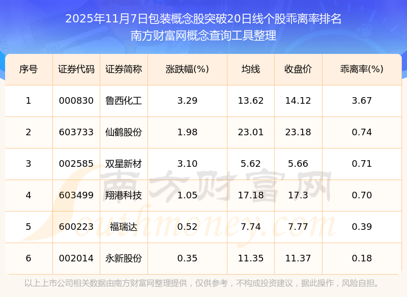 根據(jù)南方財富網(wǎng)概念查詢工具數(shù)據(jù)統(tǒng)計,截止2025年11月7日收盤,包裝概念股共有6只個股收盤價向上突破了20日線。其中乖離率較大的個股有魯西化工、仙鶴股份、雙星新材等,乖離率分別為3.67%、0.74%、0.71%。