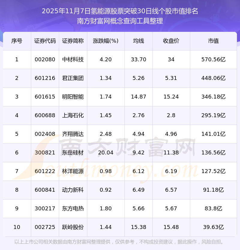 2025年11月7日氫能源股票突破30日線個股市值排名