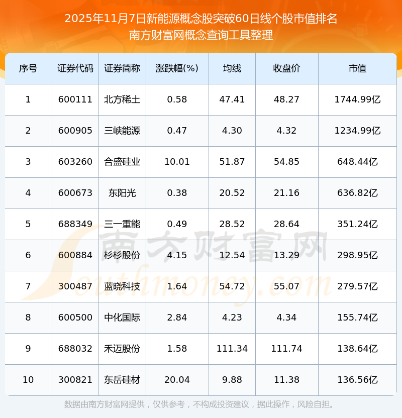 2025年11月7日新能源概念股突破60日線個(gè)股市值排名