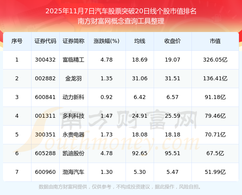 根據(jù)南方財富網(wǎng)概念查詢工具數(shù)據(jù)統(tǒng)計,截止2025年11月7日收盤,汽車股票共有7只個股收盤價向上突破了20日線。其中市值較大的個股有富臨精工、金龍羽、動力新科等,市值分別為326.05億、136.41億、91.18億。