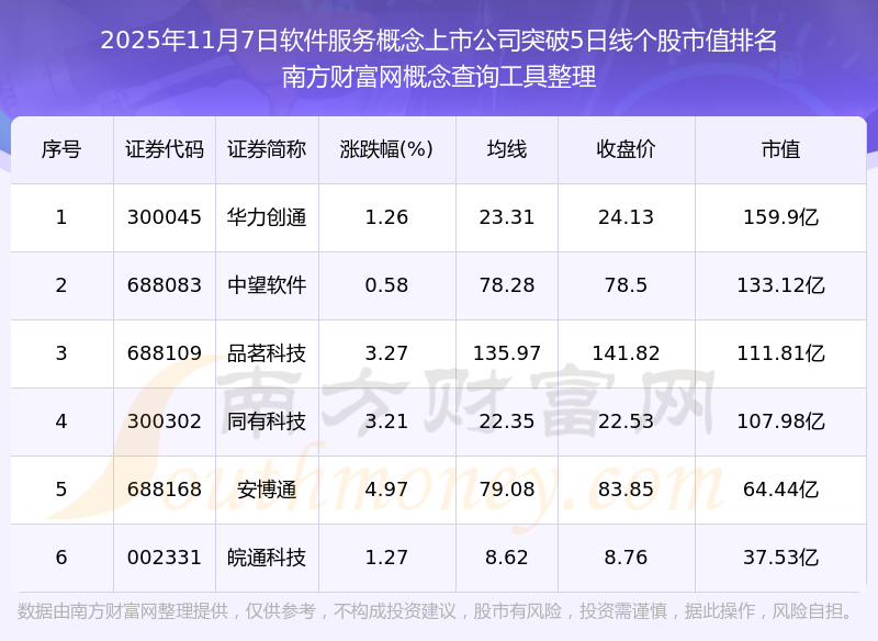 2025年11月7日軟件服務(wù)概念上市公司突破5日線個(gè)股市值排名