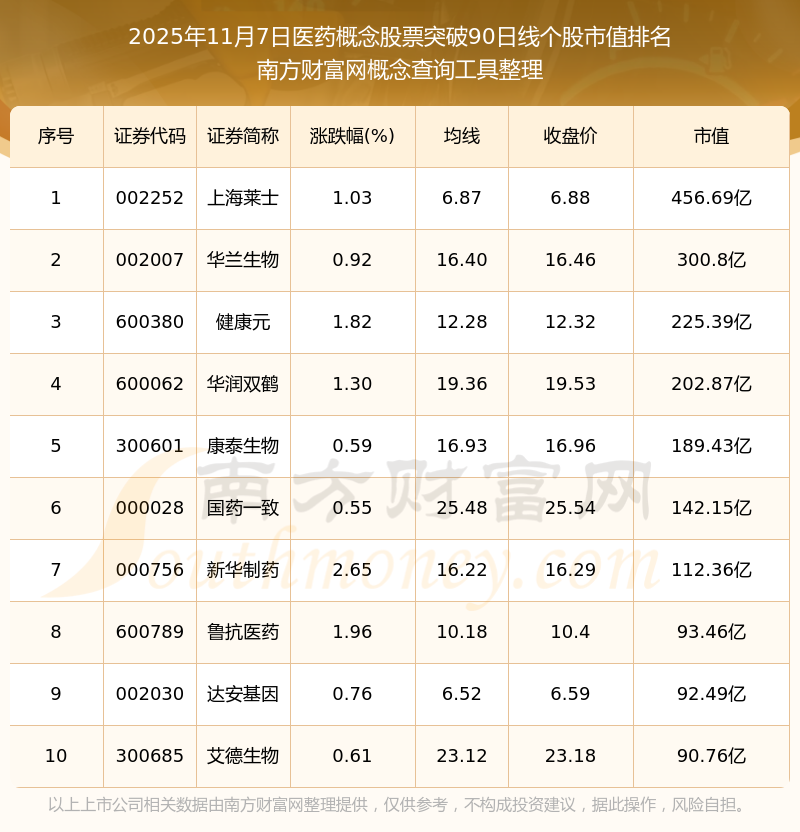 2025年11月7日醫(yī)藥概念股票突破90日線個股市值排名