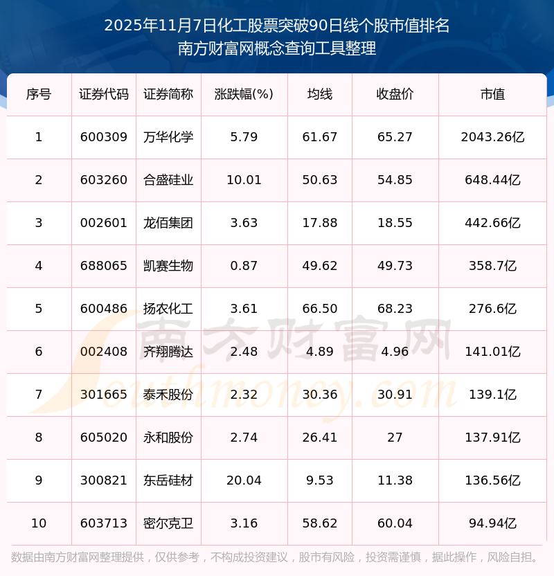 根據(jù)南方財富網(wǎng)概念查詢工具數(shù)據(jù)統(tǒng)計,截止2025年11月7日收盤,化工股票共有33只個股收盤價向上突破了90日線。其中市值較大的個股有萬華化學(xué)、合盛硅業(yè)、龍佰集團等,市值分別為2043.26億、648.44億、442.66億。
