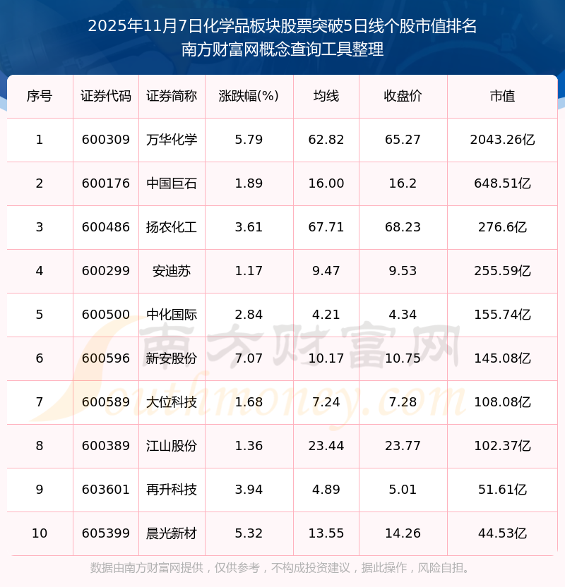 2025年11月7日化學(xué)品板塊股票突破5日線個(gè)股市值排名