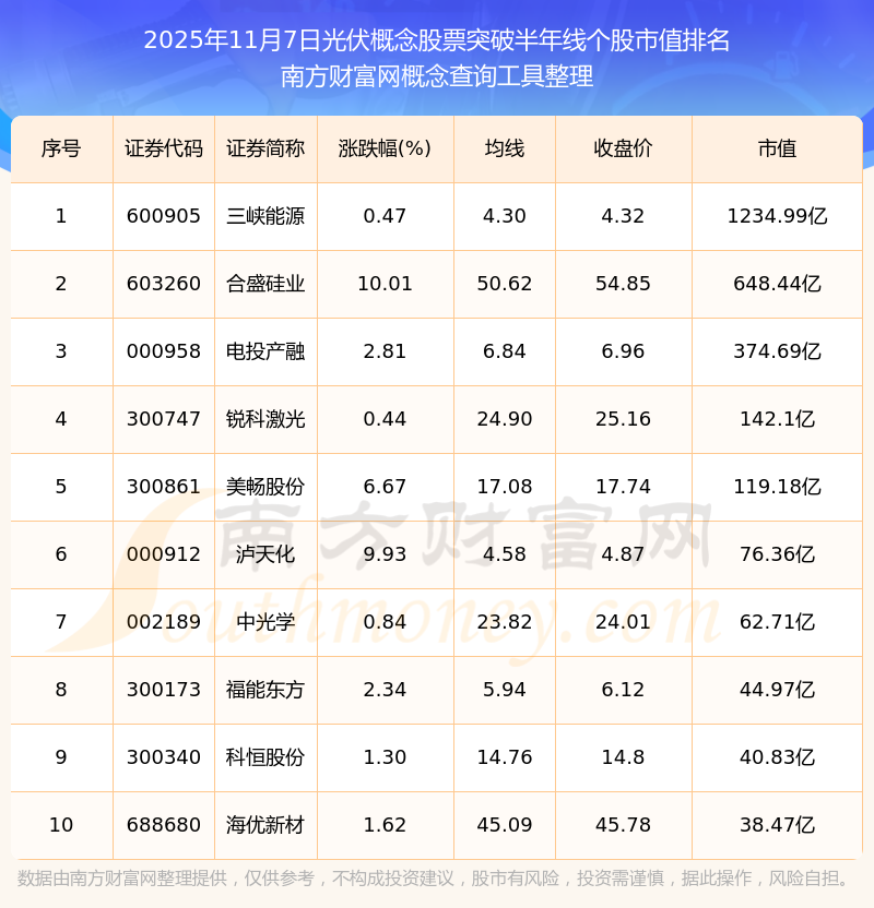 根據(jù)南方財富網(wǎng)概念查詢工具數(shù)據(jù)統(tǒng)計,截止2025年11月7日收盤,光伏概念股票共有10只個股收盤價向上突破了半年線。其中市值較大的個股有三峽能源、合盛硅業(yè)、電投產(chǎn)融等,市值分別為1234.99億、648.44億、374.69億。