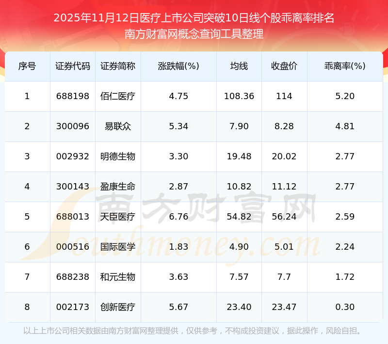 2025年11月12日醫(yī)療上市公司突破10日線個(gè)股乖離率排名