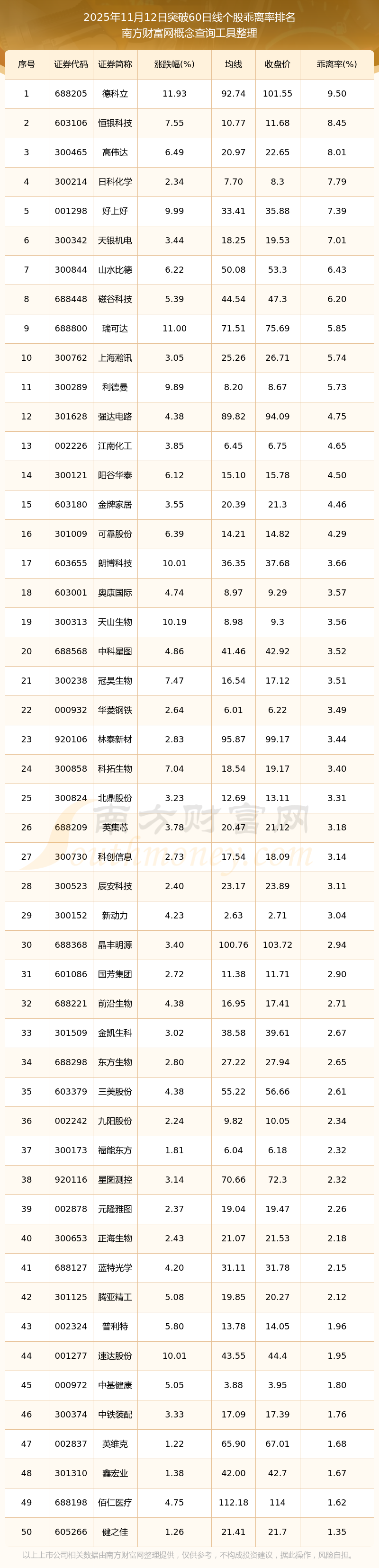 2025年11月12日突破60日線個(gè)股乖離率排名