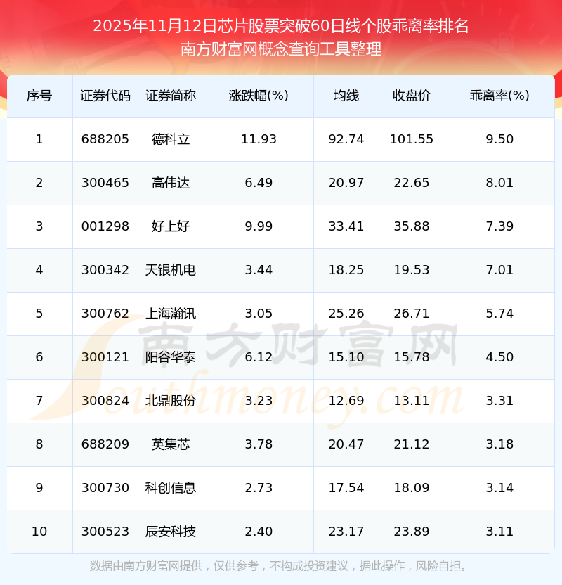 2025年11月12日芯片股票突破60日線個(gè)股乖離率排名