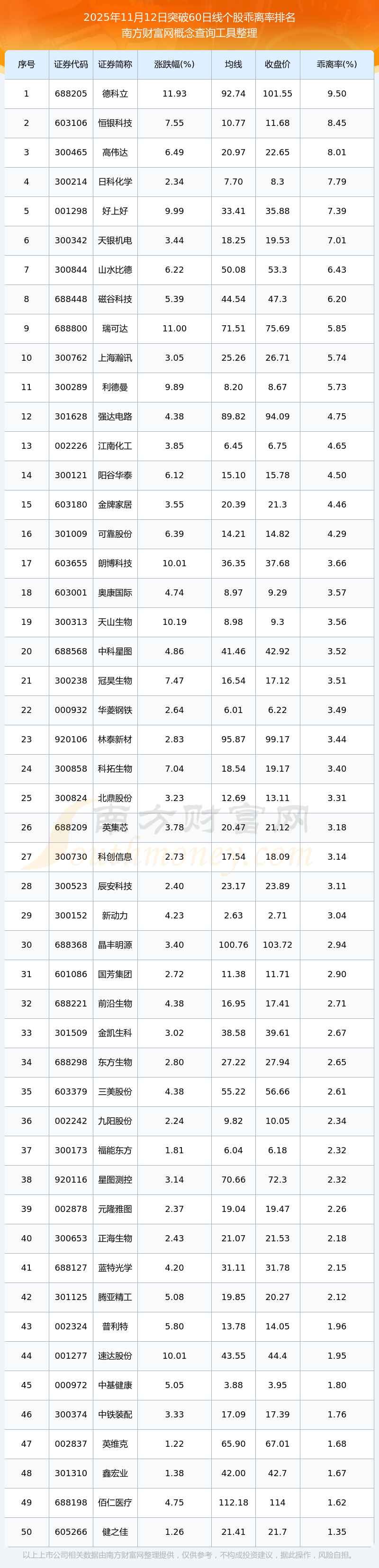 2025年11月12日突破60日線(xiàn)個(gè)股乖離率排名