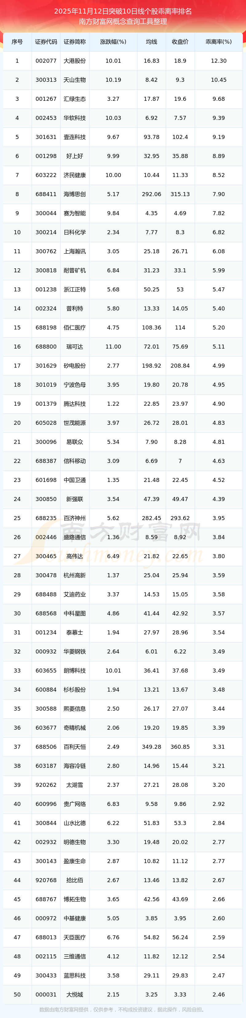 根據(jù)南方財富網(wǎng)概念查詢工具數(shù)據(jù)統(tǒng)計,截止2025年11月12日收盤,共有103只個股收盤價向上突破了10日線,其中乖離率較大的個股有大港股份、天山生物、匯綠生態(tài)、華軟科技、壹連科技等,乖離率分別為12.30%、10.45%、9.68%、9.39%、9.19%。